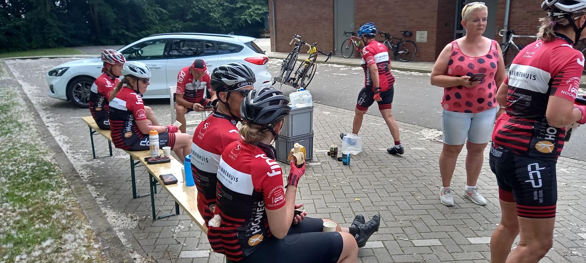 Tussendoor waren er een aantal verzorgingsposten waar iedereen voorzien werd van de nodige hapjes, drankjes en peptalks..